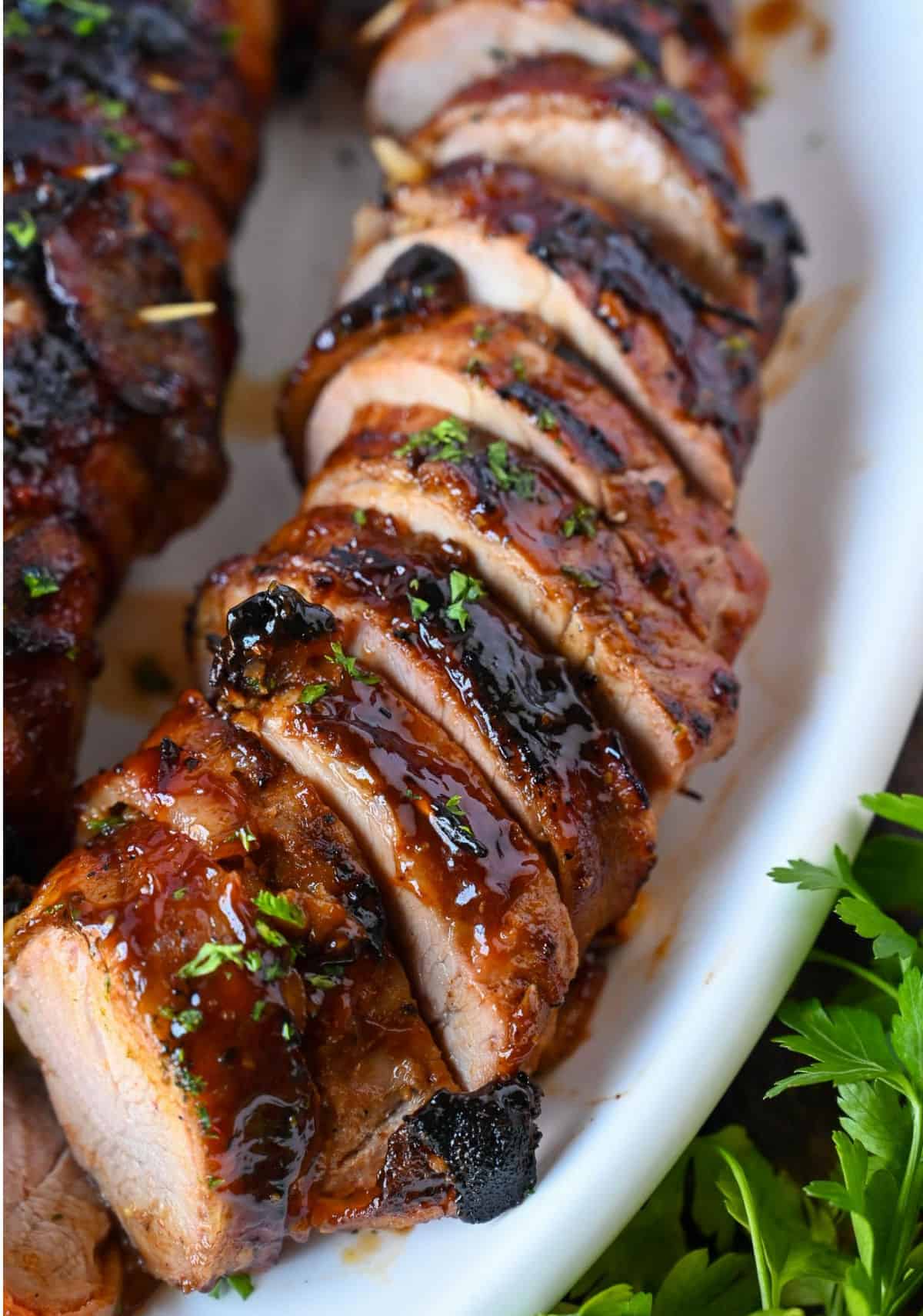 Grilled bacon-wrapped pork tenderloin is tender and juicy wrapped in smokey bacon with a homemade bourbon bbq sauce and grilled to perfection.