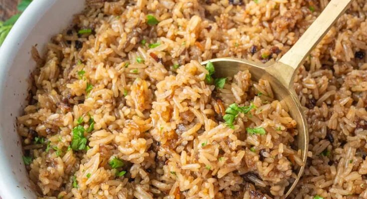 French Onion Rice Bake is also known as stick of butter rice is made with long grain rice, French onion soup, butter, pepper, and beef consommé.